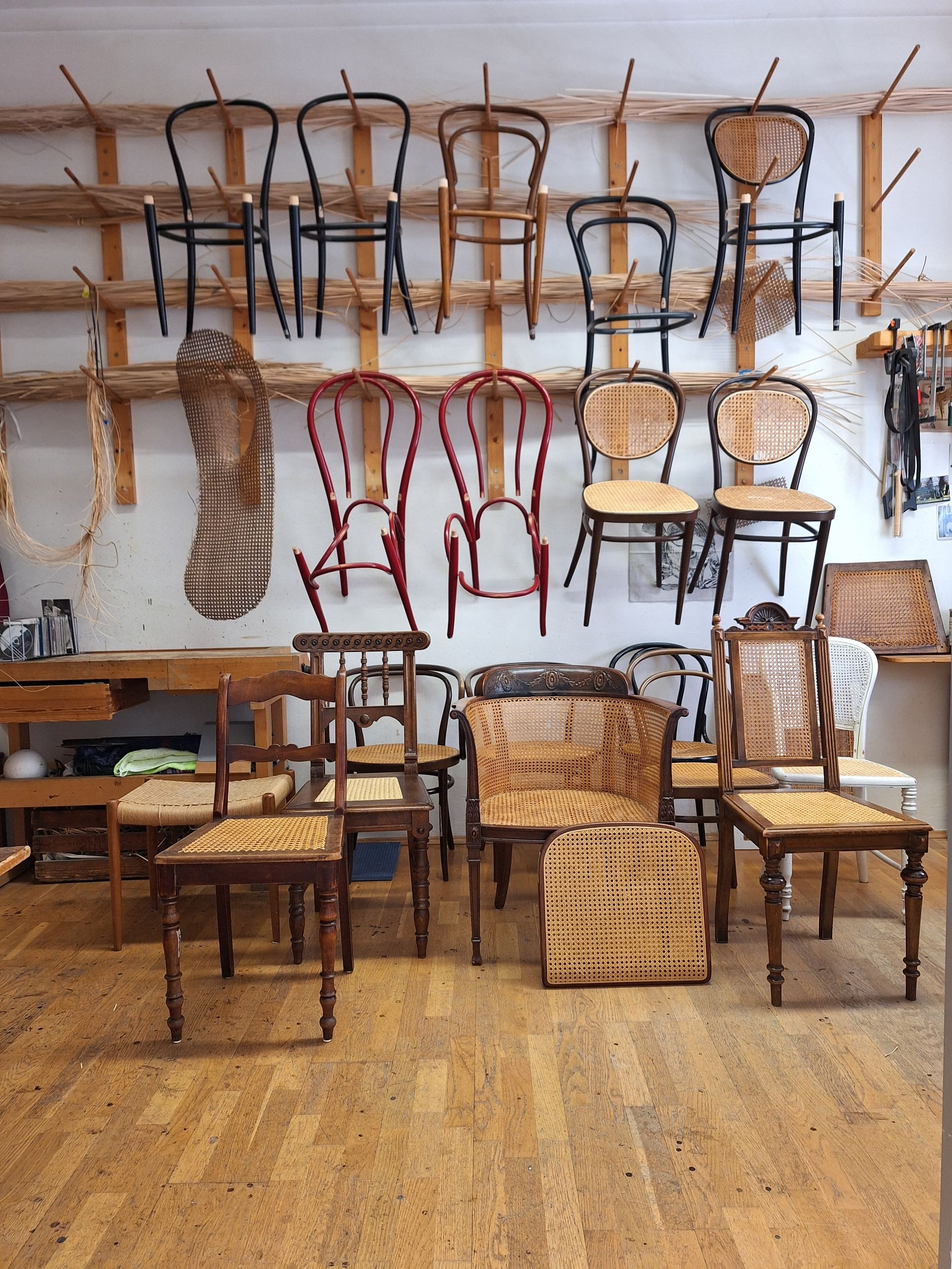 Im Jahr 1987 eröffnete ich nach bestandener Meisterprüfung im Korbmacherhandwerk meine eigene Werkstatt in München. Dabei wurde ich von meinem ersten Mitarbeiter unterstützt, der sich auf das Wiener Geflecht spezialisierte – jenes filigrane Muster, das auf den Sitzflächen und Rückenlehnen vieler Thonet-, Gründerzeit-, Biedermeier- und Chippendale-Stühle zu finden ist.