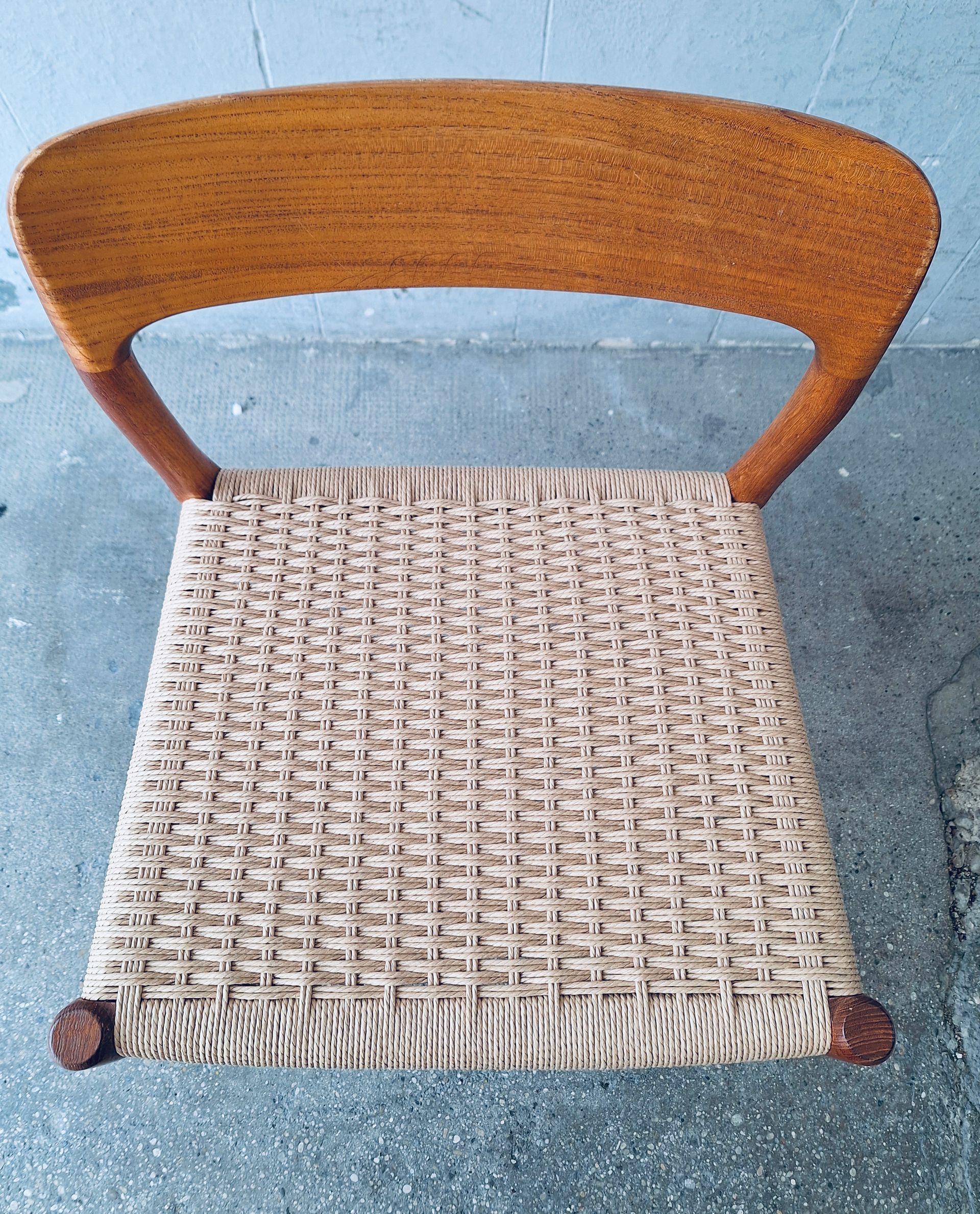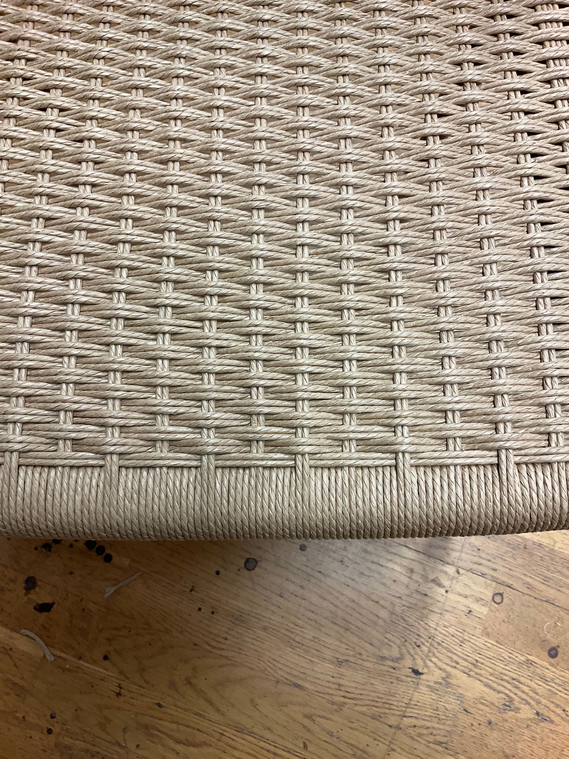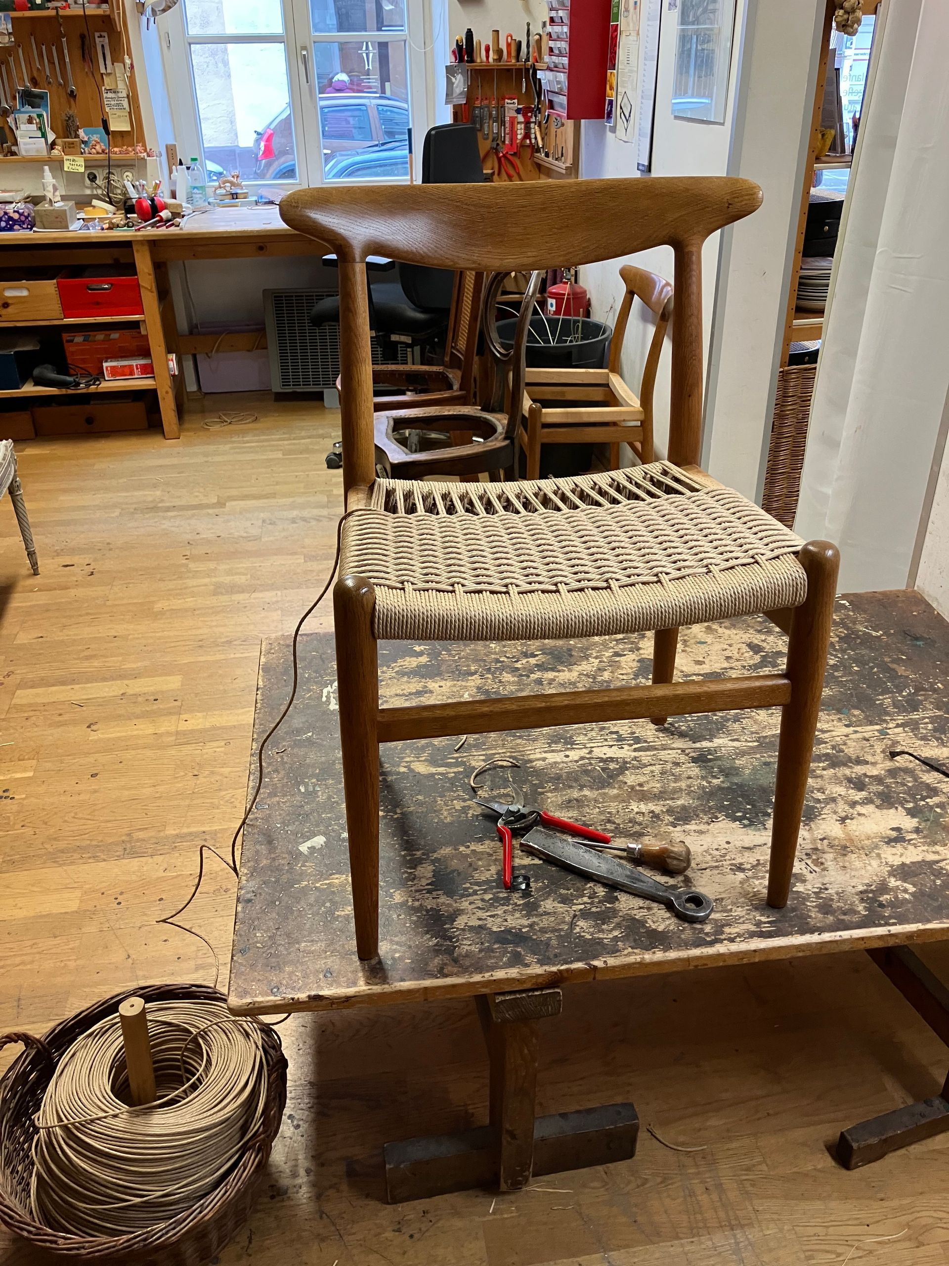 Wir flechten die Sitzflächen originalgetreu mit dänischer Papierschnur neu. Zur Erneuerung des Geflechts wird eine Endlosschnur verwendet. Sie wird über an der Unterseite des Stuhls angebrachte Haken geflochten. Die Papierschnur hat sich seit Jahrzehnten bewährt – richtig verarbeitet halten die Sitzflächen bei normaler Nutzung weit über 20 Jahre.